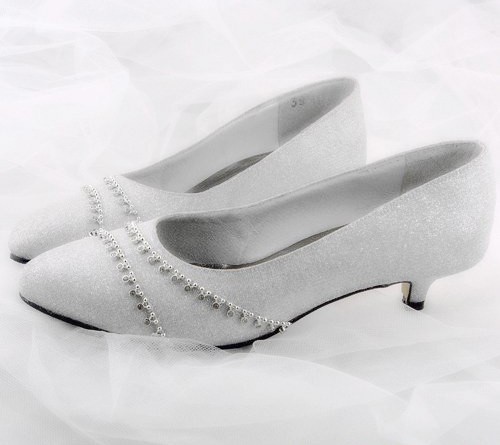 锻面的白色高跟鞋,穿起来很高雅,一点点的绣花使鞋面不会太过朴素,可以搭配有蕾丝,或绣面的礼服,营造整体感。